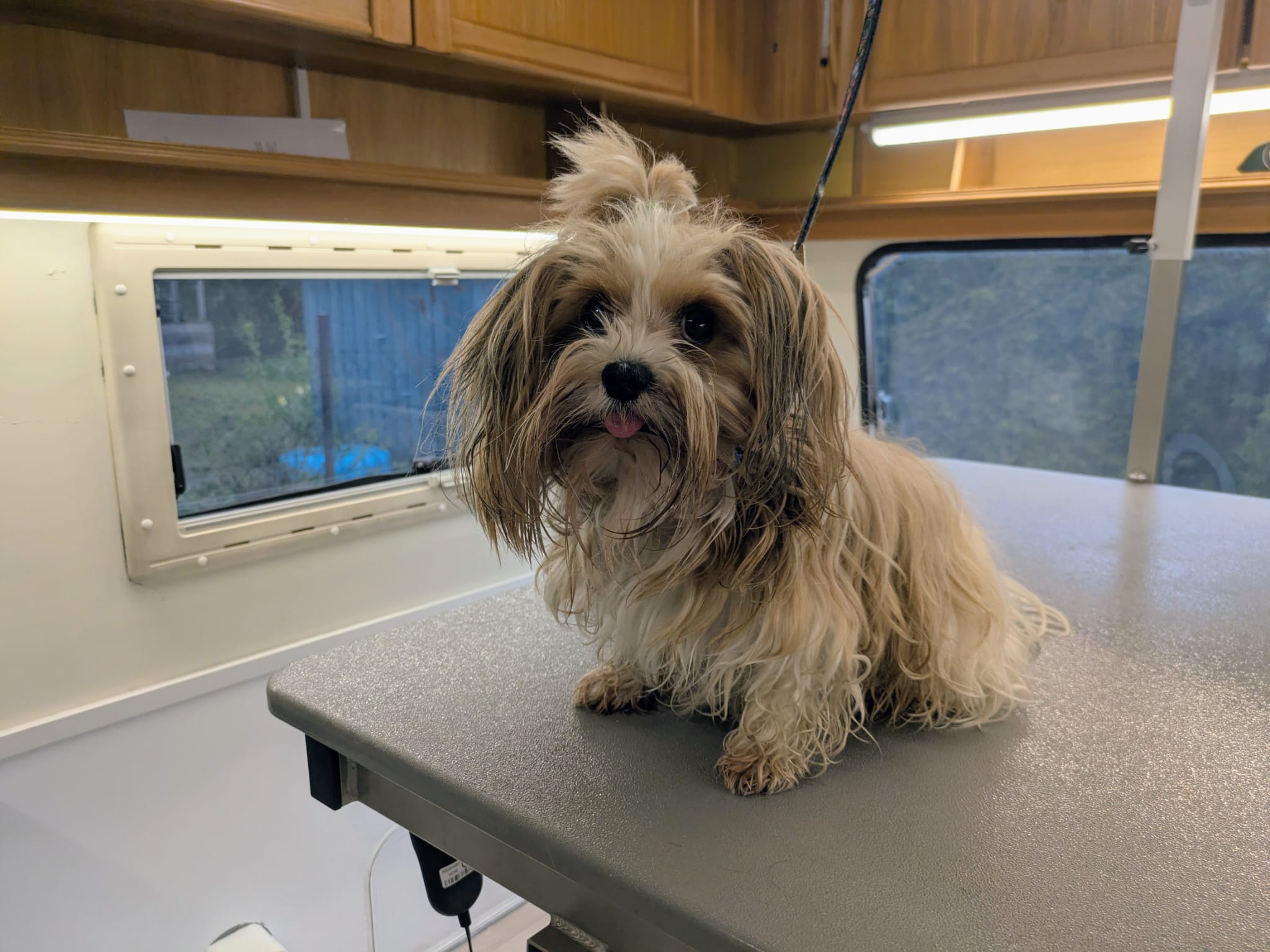 Merlin erhielt in Ronnys Pflegehütte eine komplette Pflege mit Baden, Föhnen und gründlichem Bürsten. Es wurde nur eine dezente Fasson geschnitten, um die Grundlänge seines schönen Fells zu erhalten – dank der guten Bürstpflege von Frauli kein Problem! Statt die Augen freizuschneiden, trägt Merlin seinen typischen Zopf, der natürlich wieder frisch gemacht wurde.